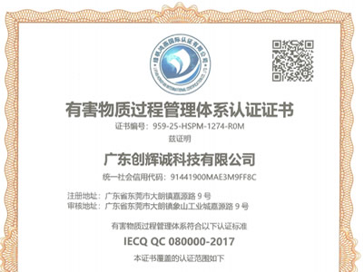 廣東創(chuàng)輝誠通過QC080000-2017... 2025年4月22日廣東創(chuàng)輝誠科技有限公司順利通過QC080000-2017體系認(rèn)證。 創(chuàng)輝誠自2004年成立以來一直致力于從事連接器、線纜組件... More+